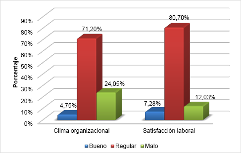 Como resumen de los resultados descriptivos porcentuales, en el Gráfico 1 para ambas variables, se tiene que la percepción de los trabajadores sobre el clima organizacional es de 71.20% como regular, el 24.05% como malo y el 4.75% lo percibe como bueno, concluyendo que la mayoría de los trabajadores percibe un nivel regular en la referida variable. Respecto a la satisfacción laboral, el 80.70% de los trabajadores percibe un nivel regular, mientras que el 12.03% la percibe como malo, finalmente el 7.28% la percibe como bueno, concluyendo que la mayoría de los trabajadores perciben en un nivel regular la satisfacción laboral.