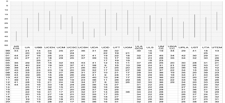 La información sobre las posiciones y recorridos que han tenido las 19 casas de estudio se pueden comprobar en la figura 3. Queda en evidencia que en este grupo comienzan a mostrarse instituciones con una alta diferencia entre su mejor y peor posición, siendo la UDD la que ha recorrido de forma más abrupta parte del listado, con una disparidad de 30 puestos (del 39 al 9); otros casos serían las universidades UGM y UTA (28 y 27 respectivamente).