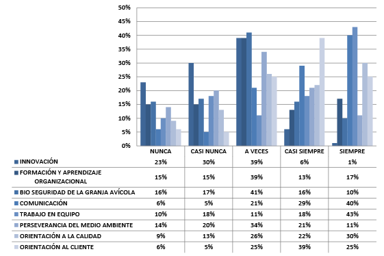 Una vez contrastada la información se procede aplicar la encuesta a la muestra seleccionada de 140 individuos de la avícola GENÉTICA Nacional S.A., estos se seleccionaron de manera aleatoria y contemplando el cálculo de la muestra. Los resultados de la encuesta aplicada se procesaron mediante tablas de frecuencia, y promedios para el cálculo de cada competencia, los resultados se visualizan en el gráfico 1.