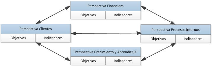 La estructura fundamental del BSC, se ilustrada en el diagrama 4, contempla indicadores de desempeño asociados a los objetivos organizacionales, establecidos para cuatro perspectivas: financiera, relaciones con los clientes, procesos internos, y aprendizaje y crecimiento. Sin embargo, se debe tener presente que el BSC es un modelo que debe ser adaptado de acuerdo con las características y estrategias particulares de cada empresa o industria, gracias a su flexibilidad y oportunidad de agregar otras perspectivas, o de reemplazar una por otra, lo que ha permitido que sea aplicado en diferentes industrias (Asosheh, Nalchigar y Jamporazmey, 2010).