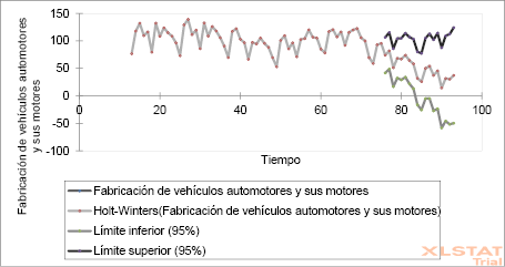 Se tasaron tres series exponenciales simples no dependientes de nivel, tendencia y estacionales. Son interdependientes en el sentido de que los tres componentes deben actualizarse cada período (Preslav et al, 2018). En el estudio se partió del histórico de variación de índices de producción del sector metalmecánico para la República de Colombia con proyección de 18 meses hacia adelante y comprender los factores que afectan la productividad y competitividad de sector industrial metalmecánico (López, 2016)