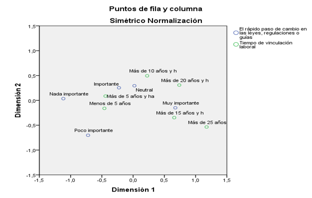 Análisis de correspondencias simples entre el tiempo de vinculación laboral de la población estudiada y el rápido cambio en las leyes, regulaciones o guías.