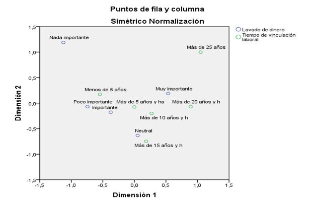 Análisis de correspondencias simples entre el tiempo de vinculación laboral de la población estudiada y el lavado de dinero