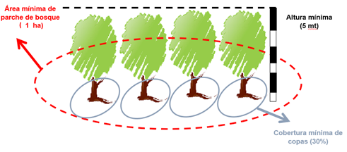 Para el caso de los proyectos forestales de mitigación de emisiones de gases de efecto invernadero mediante la ejecución de actividades en el sector forestal, las características que deben poseer las coberturas vegetales para ser consideradas como bosque, con base en los rangos de superficie, altura mínima y cubierta de copa son: 5 metros de altura, un mínimo de 1 hectárea y 30% de cobertura de copa ilustración 3.