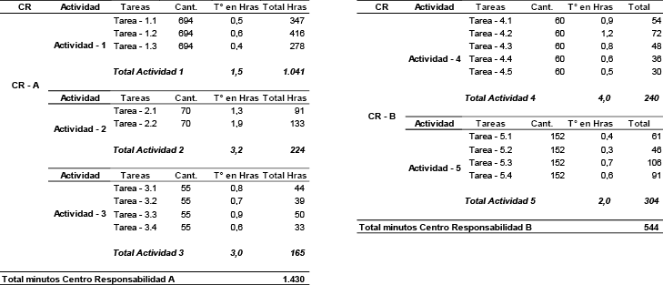 Se presenta a continuación, con un ejemplo, la metodología de trabajo de las principales componentes que requiere TDABC, para una empresa que cuenta con dos Departamentos entre los cuales se identificaron, los costos de producción o servicio de cada departamento, 5 actividades de las cuales 3 corresponden al Centro de Responsabilidad. “A” y 2 al Centro de Responsabilidad “B”, los tiempos en horas por cada actividad, los tiempos en pausa por departamento, el tiempo contratado y el tiempo efectivo de trabajo. Los pasos a seguir son los siguientes