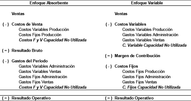 La determinación de costos de la capacidad suministrada a cada centro de responsabilidad, obtenida de la información contable y separada en sus componentes fijos y variables dará lugar a la determinación de una tasa de costos de la capacidad variable y por consiguiente a la identificación de la capacidad variable no utilizada por centro de responsabilidad y para el conjunto de la organización en su estado de resultado.