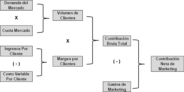Si retrocedemos en la determinación de la Contribución Bruta Total, del diagrama 3, nos encontramos con el Volumen de Clientes y por consiguiente tenemos estimaciones de Demanda de Mercado y de Cuota de Mercado.