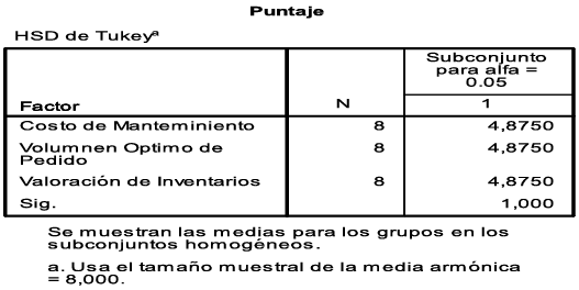 En la tabla 2, se presentan los resultados de la comparación establecida, donde la prueba de múltiples rangos de Tukey se ubicó un solo subconjunto, establecido por la igualdad de comportamientos entre sus medias, originado por la puntuación de los tres indicadores: Costo de Mantenimiento, Volumen óptimo de Pedido y Valoración de Inventarios, con un promedio de = 4,87 ptos para cada indicador, por ello se interpreta que según el resultado de la opinión de la población objeto de estudio, los tres indicadores los consideran como factores importantes de la gestión del inventario en las industrias del sub-sector lácteo del estado Zulia.