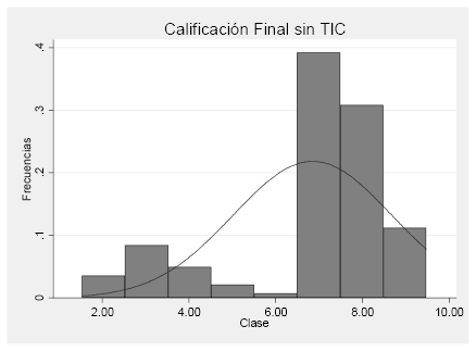 El promedio de calificaciones de los estudiantes que recibieron clases sin TIC fue de 6.85 puntos. El 50% de los estudiantes obtuvieron calificaciones por debajo de 7.30 puntos, la calificación que más veces se repitió entre los estudiantes fue de 7 puntos. Las calificaciones de los estudiantes tienen una variación promedio de 1.82 puntos con respecto a la calificación promedio de los estudiantes que recibieron sus clases sin el uso de las TIC. (Tabla 1).
