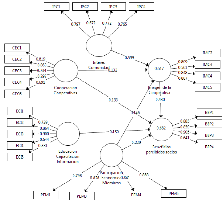 El análisis del modelo estructural confirma que los principios cooperativos (Interés por la comunidad, Cooperación entre cooperativas y Participación Económica de sus miembros) tienen un impacto positivo en la imagen de la cooperativa de forma directa. De igual forma los principios cooperativos (Cooperación entre cooperativas, Participación Económica de sus miembros, Educación, Capacitacion y Informacion) y la Imagen de la Cooperativa tienen un impacto positivo en la en los beneficios percibidos por los socios de la misma. Este efecto resulta significativo basado en t de una cola de prueba y un nivel de significatividad de p<0.001.