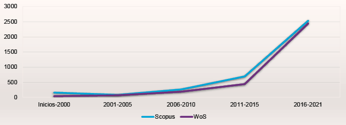 Se destaca que, en los últimos 10 años, en ambas bases de datos se ha publicado más del ochenta por ciento, de toda la productividad científica (84% en Scopus y 89% en Web of Science), en el año 2021 se publicó la mayor cantidad de artículos (618 en Scopus y 573 en Web of Science), lo que va refleja, la importancia que va teniendo este tema en la comunidad global.