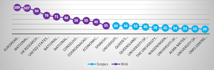 En Scopus, 13 paises tienen más de 100 articulos cada uno, mientras que en la Web of Science 11 países tienen dicho registro, existe una coincidencia de al menos un 90%, están en los primeros diez lugares, a nivel de países que producen más artículos. En los cinco primeros lugares hay una coincidencia total (entre Scopus y Web of Science), liderando de manera clara Estados Unidos, seguido de Reino Unido, China, España e Italia, en los lugares sexto al décimo, hay una coincidencia de 4 países, Australia, Alemania, Brasil y Países Bajos.