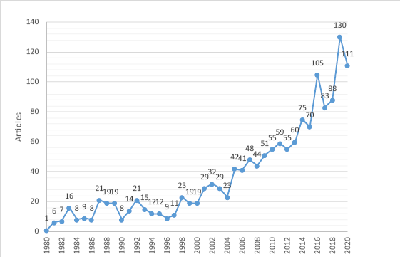 Chart 1 shows the scientific production per year of publications dealing with venture capital, between 1980-2020. It is clear there is crucial evolution in the state of the art related to the subject. In the last 15 years, there is an increase in the trend of these studies. By 2004, the production of articles on the subject was 22 articles, however, by 2005, there were a total of 42 publications, showing a pattern of a growing trend in this type of scientific work. The highest peak in publications takes place in 2016 and 2019, with 105 and 130 publications respectively. By 2020, the graph shows a decline in production with 111 publications, since high-quality journals have a natural lag in their publication processes, so the total number of published articles may not be reflected in this specific year.