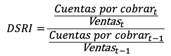 Índice de ventas (DSRI) mide la relación del crecimiento de las ventas al crédito y las ventas del ejercicio en comparación con el año actual versus el año anterior. Un crecimiento proporcional de las cuentas por cobrar por concepto de ventas representa una implementación de una política comercial que garantice las ventas a créditos; sin embargo, un aumento desproporcional de las cuentas por cobrar por concepto de ventas podría indicar un aumento simulado de las ventas.
