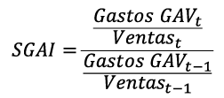 Índice de Gastos Generales, Administrativos y de Ventas [SGAI], el índice es una medida de la relación SGAI a ventas en un año con respecto al año anterior. Una variación (aumento) de los gastos generales, administrativos y de ventas es una señal negativa sobre el desempeño financiero de la empresa, esta situación pudiera ser conllevar a cometer fraude.