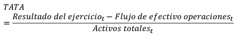 Índice de acumulaciones totales a activos totales [TATA]: Relaciona los resultados del ejercicio, con el flujo de efectivo de las actividades de explotación y el total activo. Este índice mide indica el grado en que los directivos hacen un manejo discrecional de las alternativas contables para alterar los resultados (Terreno, et al, 2020).