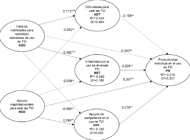 En el contexto de estudiantes universitarios: a) la variación de las dificultades para usar las TIC es explicada en un 52.4% por la variación de la falta de habilidades para satisfacer las demandas de uso de TIC, es decir, la implementación de las TIC en las universidades aumenta los requerimientos académicos y de habilidades técnicas para los estudiantes, quienes probablemente experimentan una mayor dificultad en el desarrollo de sus tareas y un sentimiento de ambigüedad respecto al rol que jugará la institución en ese contexto, lo que ayudaría a explicar las dificultades que experimentan los estudiantes para utilizar las TIC, creándose un desajuste entre las habilidades de estudiantes y las demandas de la universidad; b) la variación de la irritabilidad por el uso de diversas TIC es explicada en un 24% por la falta de habilidades para satisfacer las demandas de uso de TIC, es decir, las TIC muchas veces requieren ser reconfiguradas y personalizadas antes de aplicarse al ámbito académico estudiantil, pero estas modificaciones podrían significar problemas como fallas del sistema, pérdidas de datos y uso de recursos técnicos inadecuados, no cumpliéndose los requerimientos de los estudiantes, no satisfaciendo sus necesidades y afectando su desempeño, lo que ayudaría a explicar la irritabilidad de los estudiantes por el uso de las TIC; c) la variación de los apoyos de compañeros en el uso de TIC es explicada en un 10% por la variación de los apoyos organizacionales para el uso de las TIC, es decir, el apoyo de la institución para preparar a los estudiantes en el uso de TIC, los recursos y soporte requeridos para utilizar las TIC en el proceso de aprendizaje, ayudaría a explicar el apoyo de los compañeros en el uso de TIC; d) la variación de la productividad individual de los estudiantes en el uso de TIC es explicada en un 31.5% por la variación de la irritabilidad por el uso de diversas TIC, por los apoyos organizacionales para el uso de las TIC y por los apoyos de los compañeros en el uso de las TIC, es decir, los tres aspectos señalados (irritabilidad, apoyo organizacional y apoyo compañeros) ayudarían a explicar el grado en que las TIC colaboran con los estudiantes a cumplir los requerimientos académicos de la universidad, afectando en consecuencia el nivel de productividad individual de los estudiantes en el uso de TIC, no obstante, son los apoyos institucionales para usar las TIC los que mayor intervienen en los niveles de productividad individual en el uso de TIC de los estudiantes universitarios.