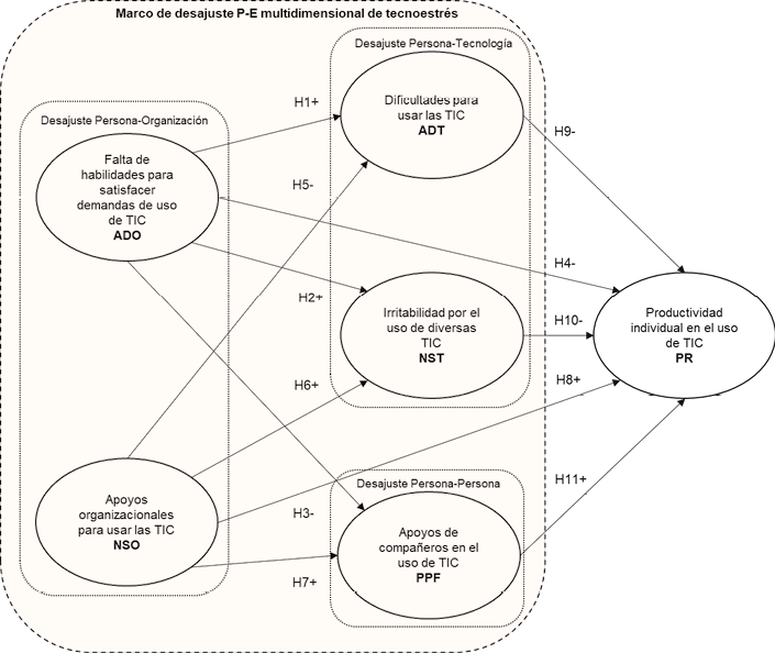 A medida que las TIC se convierten gradualmente en una parte integrada de las universidades, tienen una influencia creciente en el desempeño de los estudiantes y en el éxito de estas entidades educadoras. De acuerdo con Chuang, Shen & Judge, (2016), el ajuste entre los estudiantes universitarios y las múltiples dimensiones del entorno de la educación superior conducen a un mejor desempeño académico, mientras que el desajuste resulta en lo contrario. En línea con lo realizado por Wang y Li (2019), para abordar el TS en la educación superior y optimizar los beneficios asociados con las TIC, se plantea que el ajuste o desajuste de P-O (que contiene ADO y NSO) es fundamental para el ajuste o desajuste de P-T (que contiene ADT y NST) y P-P. Asimismo, es importante comprender cómo la productividad individual de los estudiantes universitarios se ve afectada por las múltiples dimensiones del entorno.