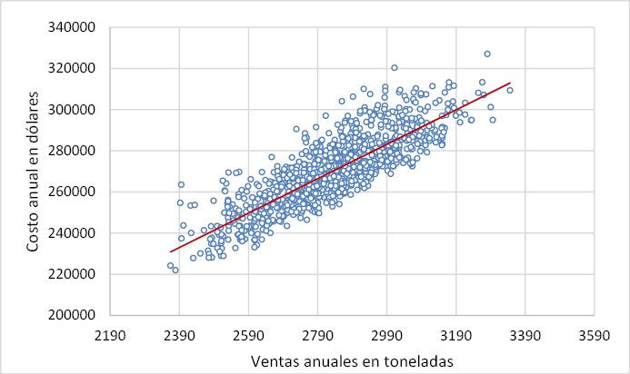Regresión lineal entre los costos anuales en dólares y las ventas anuales en toneladas utilizando una estrategia de nivelación