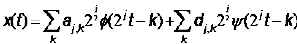 donde f(t) es una aproximación inicial de la función, donde J es la escala máxima permitida para el número de puntos de datos disponibles, en este caso, el número posible de escalas de análisis está determinado por el número de observaciones (N), siendo j el límite de la escala si el número de observaciones es N ≥ 2j, y f0(t) denota fluctuaciones con periodicidad mayor que J + 1, y gj(t) = fj+1(t) - fj(t) representa el error en la aproximación de fj+1(t) por fj(t), o las fluctuaciones que contienen periodicidades entre niveles de resolución sucesivos 2J-1-j y 2J-j y el índice j está relacionado con la escala y el índice k con la traducción de las hijas de la función.