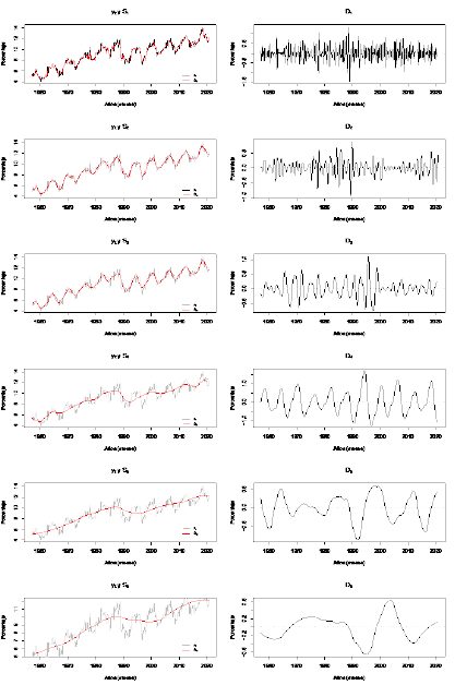 En este trabajo se ha aplicado el análisis multirresolución, en donde la serie temporal se puede reconstruir en función de las escalas previamente determinadas, que en su forma discreta se expresa de la siguiente forma (Percival & Walden, 2000; Verona, 2016).