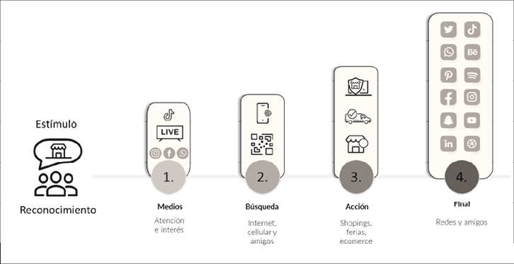 Wang et al, (2021) afirmaron que, en cada etapa, los consumidores están expuestos a factores que inciden en el proceso de decisión de compra, como los medios de comunicación en la etapa de atención e interés; Internet, teléfonos móviles y amigos en la etapa de búsqueda; centros comerciales, exposiciones, e-comercio en la etapa de acción; así como redes sociales y amigos en las etapas finales de compartir la experiencia. El proceso de decisión de compra tiene en cuenta el estímulo y reconocimiento de compra, búsqueda, selección y apreciación de información en línea, y acceso (Kim, 2021). La etapa de experimentar y compartir una experiencia tiene como premisa la adquisición, comenzando con una experiencia de consumo que puede ser en línea o privada, seguida de una evaluación de esa experiencia, una elaboración de opiniones negativas o positivas sobre un producto o servicio (Oliveira, 2019).