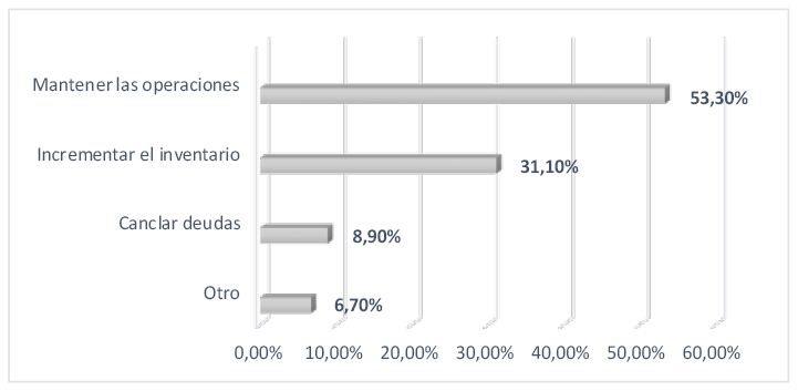 Los encargados de los negocios de la confección reportan (gráfico 2), que estos recursos de financiamiento a corto plazo han sido utilizados para mantener las operaciones de las empresas (53,30%), otro grupo los ha destinado para incrementar el inventario (31,10%), así como para cancelar deudas pendientes (8,90%). Este comportamiento se debe a las pocas posibilidades de acceso a financiamiento que tienen las empresas del sector, como señala Logreira y Bonett (2017), que llevan a destinar la mayor parte de los recursos al mantenimiento de las operaciones, sin posibilidades de invertir en tecnología. Sin embargo, es necesario que se capten fondos para la continuidad de las operaciones, que promuevan la estabilidad y futuro crecimiento.