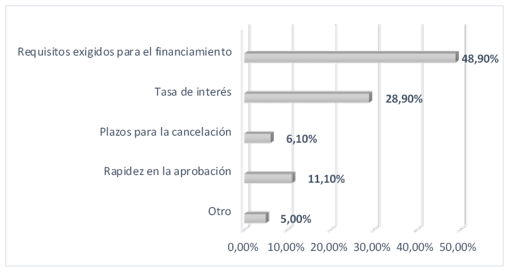 Ahora bien, el 48,90% de las micro y pequeñas empresas afirman que, para buscar financiamiento a corto plazo, consideran que de acuerdo con las condiciones establecidas por las entidades financiadoras lo solicitarían. En este sentido, el 28,90% tiene en cuenta la tasa de interés ofrecida y el 11,10% considera la rapidez en la aprobación de los recursos (gráfico 3). Boscán y Sandrea (2009), así como Díaz-Barrios y Velazco (2017) manifiestan que existen distintos criterios que permiten precisar el financiamiento para los negocios, entre estos el costo o tasas de interés, condiciones, garantías, formalización de la operación, tiempo de liquidación, entre otros aspectos.