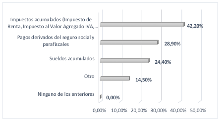 Con respecto a las deudas acumuladas como fuente de financiamiento a corto plazo, utilizado por muy pocas empresas (el 2,20%), se tiene que el 42,20% de los negocios se financian con impuestos acumulados, el 28,90% lo hace a través de pagos derivados del seguro social y el 24,40% de sueldos pendientes (gráfico 7). Esta tendencia a acumular impuestos puede traducirse en empresas morosas con esta obligación, o que mientras llega la fecha de cancelar, utilizan los recursos.