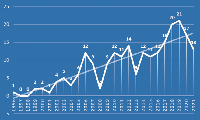 En el Gráfico 1, se muestra una línea de tendencia tipo lineal de la producción científica anual de todos los documentos, con una tasa de crecimiento anual de 11.8% durante el periodo 1996-2021. El gráfico 1 muestra una fluctuación en el total de documentos por año, comenzando el año 1996 con tan solo 1 documento, le sigue 1997 y 1998 sin ningún documento indexado en la plataforma de Scopus. Desde 1999 al 2005 la producción se proyecta a un promedio de 3,30 documentos por año hasta cuadruplicarse en el 2006 con 12 documentos, entre ellos se encuentra el artículo titulado “Inteligencia emocional y efectividad del liderazgo” desarrollado por Kerr et al, (2006). También para el 2006 se destaca la investigación titulada “Inteligencia emocional y comportamiento de liderazgo en ejecutivos de la construcción” de Butler y Chinowsky (2006).
