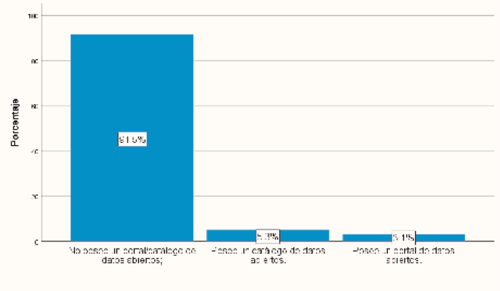 Los resultados del gráfico 2 muestran que el 91.5% de las municipalidades del Perú no poseen un portal o catálogo de datos abiertos, un 5.3% posees un catálogo de datos y solo el 3.1% de las municipalidades poseen un portal de datos abiertos. Estos resultados inciden en la falta de confianza por gestión de información reservada por temor a interpretaciones desfavorables de los grupos de interés y de la sociedad civil y por la falta de transparencia contraria a la posición de Khayyat (2020) que afirma que los datos abiertos pueden ser usados, e inclusive redistribuir libremente sin restricciones.