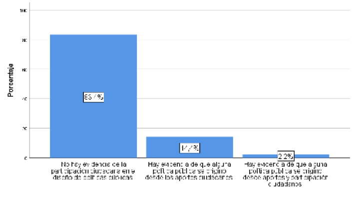 En el Gráfico 4, se presentan los resultados obtenidos de los portales institucionales de las municipalidades del Perú, observándose un 83.4% de municipios que no evidencian la participación ciudadana en el diseño de políticas públicas, el 14.4% de municipalidades evidencian que alguna de sus políticas públicas ha sido originada desde el aporte de los ciudadanos y 2.2% evidencia que alguna política pública se ha originado sobre la base del aporte y participación de los ciudadanos.
