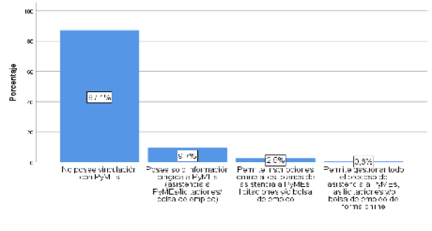 Los resultados del gráfico 7, muestra que el 87.1% de las municipalidades no poseen ningún tipo de vinculación con las PyMEs, el 9.7% poseen solo información dirigida a PyMEs como asistencia técnica a licitaciones o bolsas de empleo y el 3.1% de las municipalidades permiten en su portal web institucional inscribir y gestionar asistencia a las PyMEs, ello como estadística general.