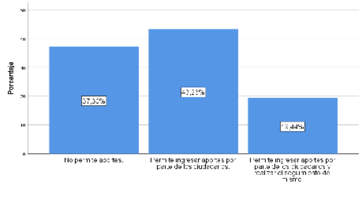 En los resultados del gráfico 8, se aprecia que 37.3% de los portales institucionales de las municipalidades no permite realizar aportes por parte de los ciudadanos, el 43.3% de las municipalidades permite ingresar aportes a los ciudadanos por medio de su portal web institucional y el 19.4% de las municipalidades permiten ingresar aportes por parte de los ciudadanos y realizar el seguimiento del mismo.