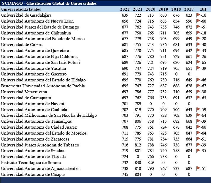 En cuanto al impacto actual de los esfuerzos realizados para mejorar la calidad, analizaremos el posicionamiento de las universidades mexicanas en la clasificación de universidades SCIMAGO (2021), donde se observa que en su mayoría decrecen en cuanto a su posición. Conforme a la metodología de esta clasificación, las instituciones académicas son evaluadas a través de indicadores que miden su desempeño en la investigación científica, la innovación y el impacto social desde la visibilidad del conocimiento que nace en estas IES. Lo anterior se detalla en la tabla 2, donde se realizó una comparación en cuanto a la evolución del desempeño de las universidades Públicas Estatales conforme a las últimas seis ediciones de la clasificación de universidades SCIMAGO (2022).