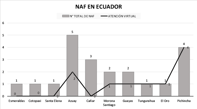 De acuerdo con el Servicio de Rentas Internas (2022) existen 21 NAF en el Ecuador distribuidos en 10 provincias: Esmeraldas, Cotopaxi, Santa Elena, Azuay, Cañar, Morona Santiago, Guayas, Tungurahua, El Oro, Pichincha; 11 prestan atención presencial y 10 en modalidad virtual, como se refleja en el Gráfico 1: