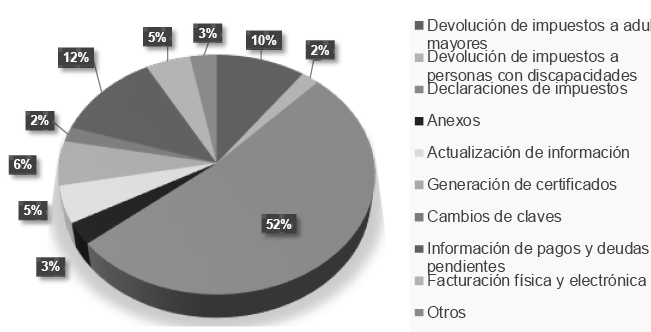Para ser parte del equipo NAF es necesario que aprueben un curso de introducción dictado por los profesionales especialistas del Servicio de Rentas Internas, esto para garantizar que los servicios que presten sean de calidad y cumplan con los requerimientos técnicos y legales que demanda la legislación ecuatoriana. En este sentido los alumnos son preparados para ayudar al contribuyente a cumplir con sus obligaciones y deberes, así como ser partícipes de los beneficios que el estado ofrece, el estudio arrojó que en los NAF ecuatorianos los servicios con mayor demanda son: declaración de impuestos, información de pagos/deudas pendientes y devolución de impuestos a adultos mayores, como se refleja en el Gráfico 2.