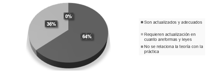 En los NAF los alumnos deben aplicar lo aprendido en teoría y solucionar problemas reales del contexto profesional, para efecto es importante que cuenten con conocimientos sólidos, actualizados. El 64% de alumnos considera que los conocimientos que imparten en las IES ecuatorianas son actualizados y adecuados mientras que el 36% opina que las cátedras requieren actualización en cuánto a leyes y reformas. Los conocimientos impartidos se pueden apreciar en el Gráfico 5.