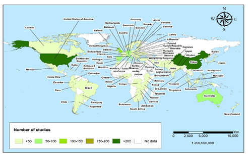 En cuanto a la distribución geográfica de las publicaciones (ilustración 1), el 40% de estas proceden de China, Estados Unidos, Reino Unido, Alemania y España, mientras que por parte de Latinoamérica sólo aparecen Brasil y México, cada uno con el 2% del total de publicaciones. Es evidente que los países desarrollados son los que más publicaciones tienen, siendo estos los que generalmente consumen más recursos naturales, por lo que tienen un particular interés en los SE que afectan directamente al bienestar de su población.