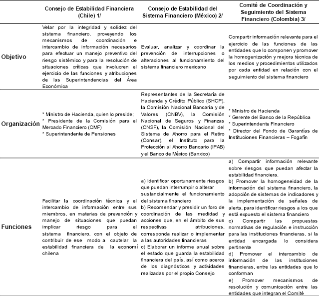Fuente: Elaboración propia con base a la información del 1/Consejo de Estabilidad Financiera de Chile, 2022. 2/Gobierno de México, Consejo de Estabilidad del Sistema Financiero, 2022. 3/Comité de Coordinación y Seguimiento del Sistema Financiero de Colombia, 2022.