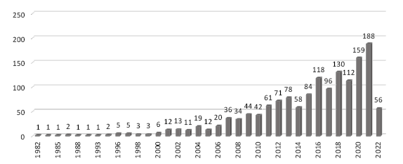 Producción total de investigaciones en fragmentación urbana en ALyC (1982-2022 preliminar)