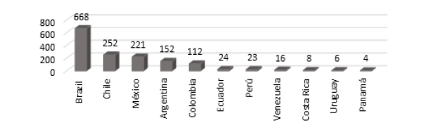 Respecto a la producción bibliográfica por afiliación de los autores en países latinoamericanos y del caribe, en el Gráfico 2 muestra como los autores con filiaciones brasileras se destaca de manera considerable.