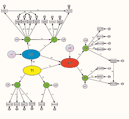 A partir del análisis factorial exploratorio se comprobó la validez del instrumento y sus reactivos con las dimensiones necesarias para modelar las relaciones, información que fue de utilidad para realizar el AFC, teniendo como resultado la comprobación del modelo propuesto, el cual a través de ecuaciones estructurales demostró resultados poco satisfactorios en las medidas de ajuste absoluto, incremental y parsimonia por lo que se realizó un modelo de ajuste el cual, logró cumplir con todas las condiciones para ser apto, finalmente se optó por la utilización del nuevo modelo ajustado así como el de sus nuevas relaciones.
