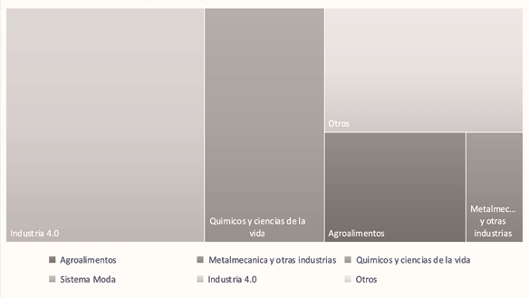 En cuanto a las cadenas productivas (ilustración 2) basado en la clasificación que hace el Ministerio de Comercio, Industria y Turismo de Colombia la mayoría son de Industria 4.0 (38%) seguido por químicos y ciencias de la vida (23%) y por agro alimentos (21%).