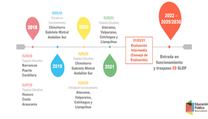 En el año 2017 el sistema escolar chileno comenzó el cambio organizacional más grande en 40 años, traspasando las escuelas públicas desde los gobiernos locales municipales que existían en cada comuna del país, a un nuevo organismo denominado Servicios Locales de Educación (SLEP). Esto implicara el cambio gradual de 345 gestores de la educación pública chilena a 70 nuevos servicios locales. El proceso es paulatino y en principio abarcará el periodo comprendido entre 2018 a 2025 (Ley 21040). Llegado el año 2025, los municipios faltantes entregarán la administración de las escuelas a los últimos servicios locales de educación.