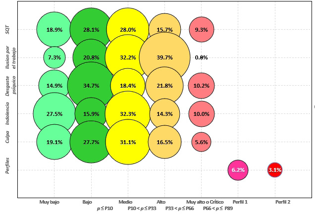 Los resultados serán presentados en dos secciones, niveles globales de burnout y perfiles de los sujetos con nivel crítico, ambas secciones desde los presupuestos de evaluación ofrecido por Gil-Monte (2011, 2019). Para la primera sección la evaluación del cuestionario se concreta a partir de calcular dos puntuaciones, la puntuación A que consta del promedio de 3 escalas, 1.- Ilusión por el trabajo -invertido- (5 ítems), Desgaste psíquico (4 ítems) e Indolencia (6 ítems), por otro lado, la puntuación B que consta del promedio de la escala de Culpa (5 ítems). A partir de allí se pueden diagnosticar 5 niveles globales de síndrome de quemarse por el trabajo (SQT) con sus respectivos percentiles (tabla 1).