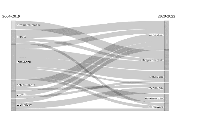 En la ilustración 3 muestra la evolución de palabras clave en la literatura, destacando el cambio en importancia de términos entre los periodos 2004-2009 y 2020-2022. “Innovation” era dominante en el primer periodo, pero menos frecuente en el segundo. “Impact” no se utilizó en 2020-2022, y otras palabras clave como “Growth,” “Firm Performance,” y “Determinants” fueron reemplazadas por “knowledge,” “organizations,” y “framework.”