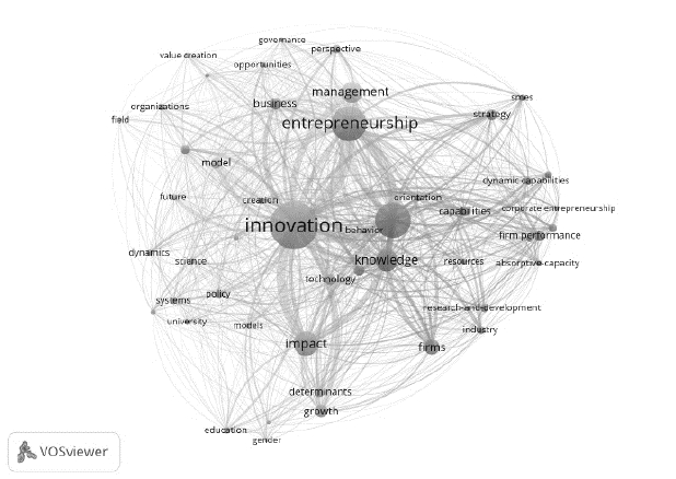Si bien con el análisis de las publicaciones y de los principales autores se ha plasmado el panorama general del estado del arte del emprendimiento y la innovación en Latinoamérica, el observar las principales palabras clave permiten reafirmar los conceptos más recurrentes en dicha literatura y la relación entre los mismos, es por ello por lo que en la ilustración 2 se presenta una gráfica con las palabras clave más relevantes de la colección extraída de Web of Science, entre ellas encontramos que, aparte de innovación y emprendimiento, la palabra “performance” e “impact” son las que más aparecen en las publicaciones.