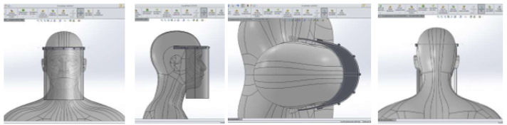 After the analysis and results of the HoQ, considering the most important technical characteristics, an approximate simulation of the design was carried out, which is presented in the Illustration 2. This shows the mask from a front view 4a), side 4b), top 4c) and back 5d). As a summary, it was defined in this way since, after reviewing the literature, it was identified that the eyes, nose, and mouth should be well protected against droplets, for which the height and length of the sheet on the face were increased (22x26 cm). With this, it is possible to better cover the lateral and frontal area of the face, in addition, the visor was given a width of 4 cm, this thinking of the comfort of the user, as well as to avoid a “suffocation feeling” by having it too close to his face; On the other hand, this amplitude helps users who need to use lenses together with the mask to feel more comfortable and not bother or bump into it.