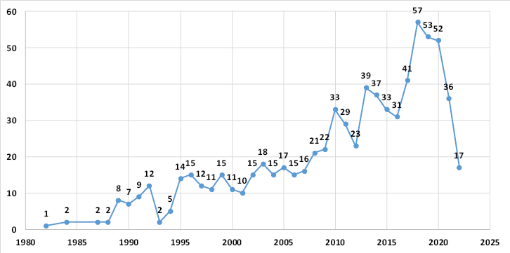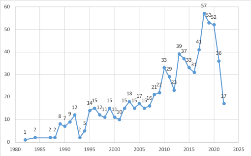Aplicando la metodología descrita en el Gráfico 1, se observó un tiempo de publicación de 1947 a junio de 2022 con un promedio de publicaciones por año de 18.95. Además, se estudiaron los tipos de documentos, autores, citaciones, entre otros aspectos en el periodo de tiempo.